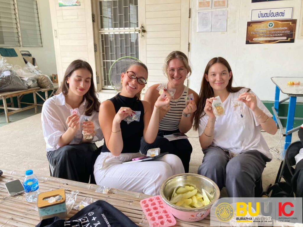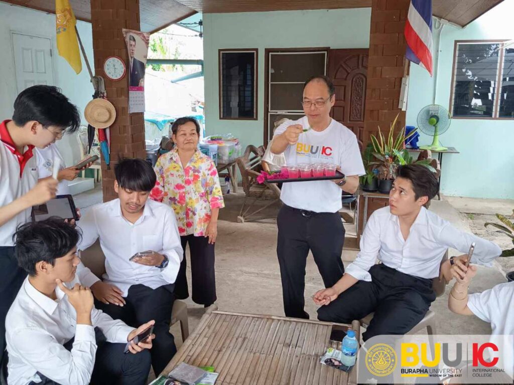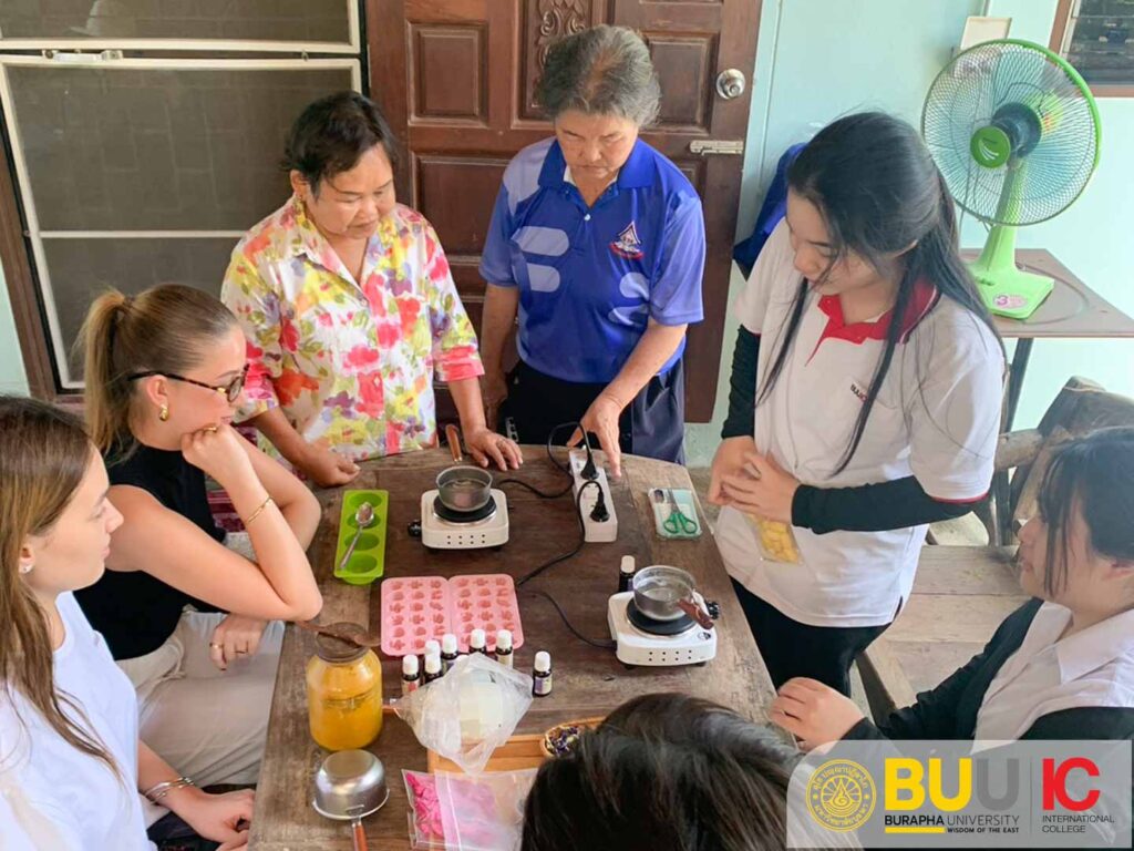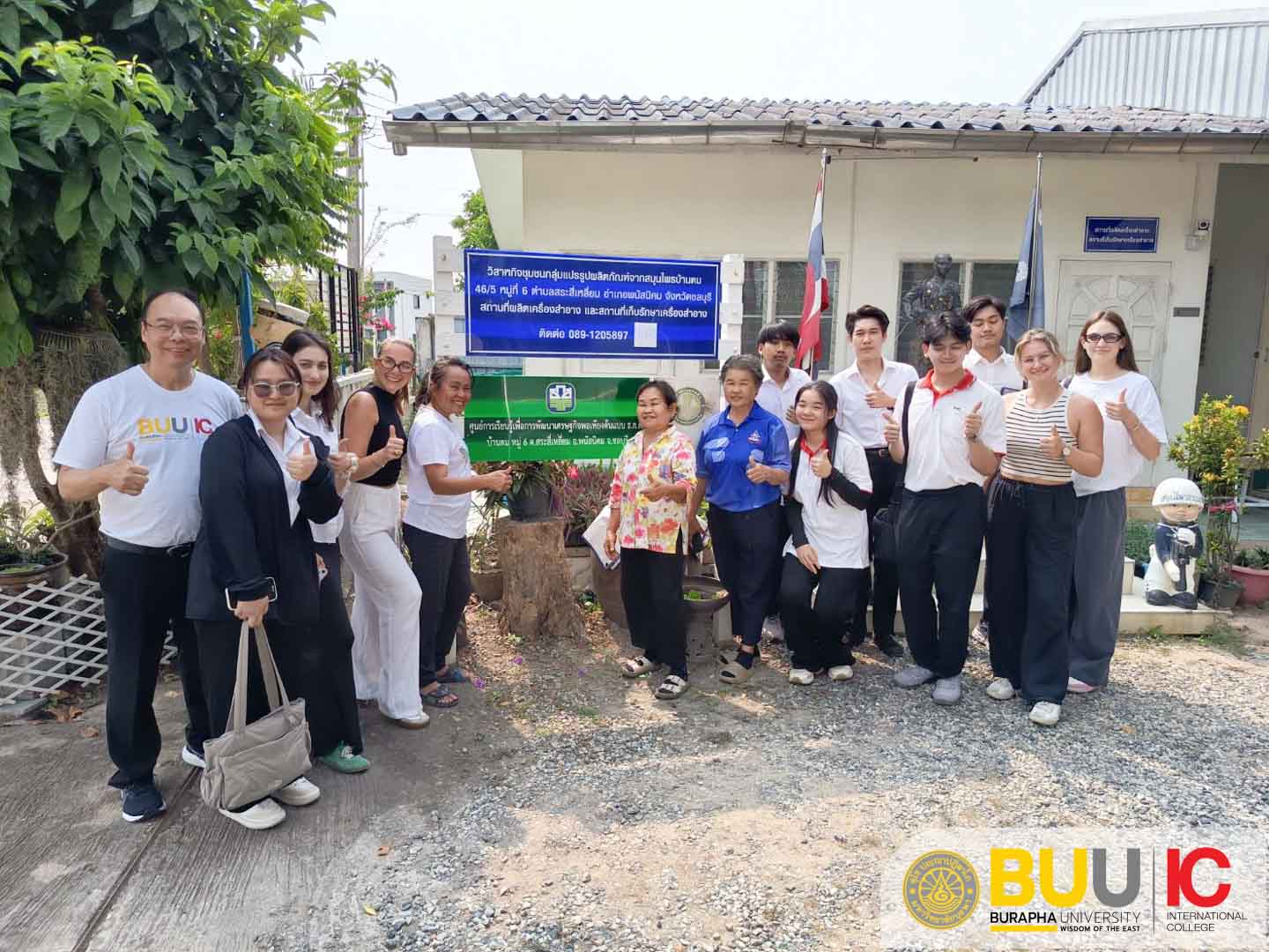 On March 5, 2026, Mr. Jirayut Pitanon, a lecturer in the Business Administration Department of the International College, along with exchange students and students from the Strategic Marketing Planning course, visited the Ban Tom Community Enterprise, a group processing herbal products in Phanat Nikhom District, Chonburi Province. The purpose was to observe the production process using local raw materials and to work collaboratively with the community. The students applied their knowledge to develop strategic plans for promising products such as soap, shampoo, and black hair dye from the Ban Tom Herbal Processing Center. The strategies focused on aligning with the needs of target markets, positioning products appropriately, designing unique brands and products, planning distribution channels, and emphasizing communication and public relations to create awareness among target groups and achieve business success for the community.