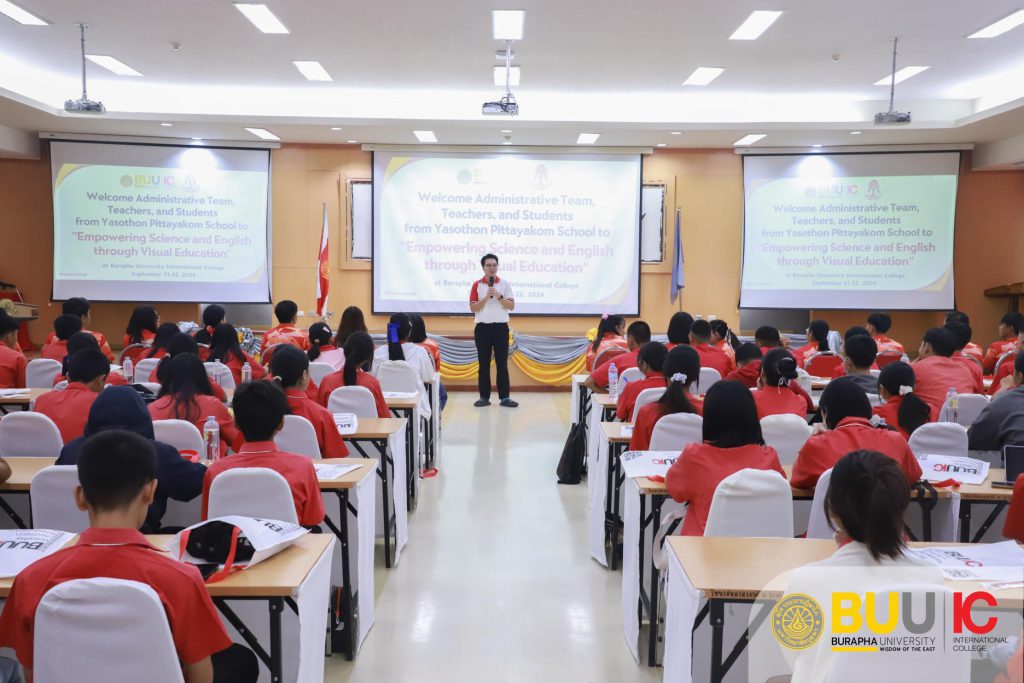 Burapha University International College organized the academic service project “Empowering Science and English through Visual Education” for students from Yasothon Pittayakom School from September 21-22, 2024. A total of 200 students participated in the project, which aimed to enhance their skills in science, mathematics, and English through field trips and hands-on activities at Burapha University International College and the Faculty of Science.